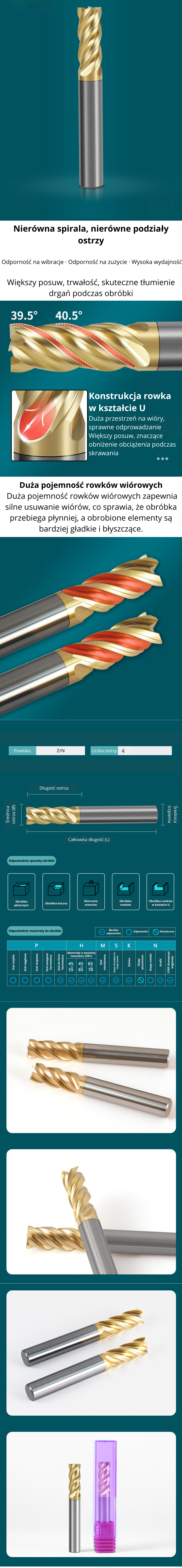 - Zmienny kąt spirali - 39.5°, 40.5° - odporny na drgania i wibracje