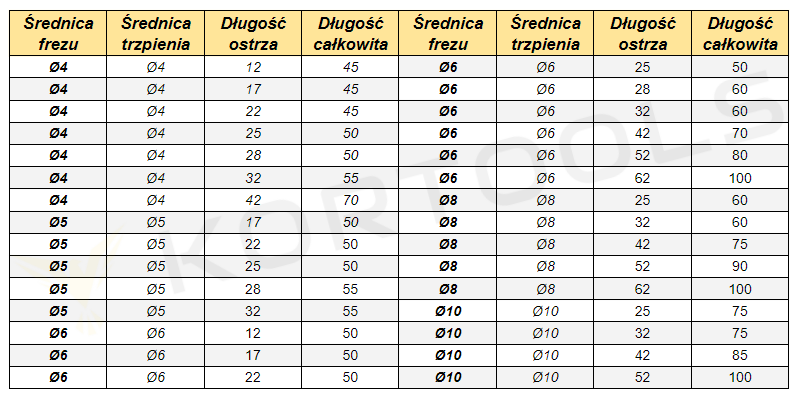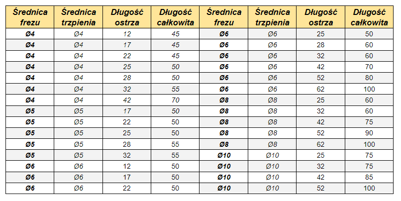 Na dole strony pełna tabela dostępnych rozmiarów frezów.