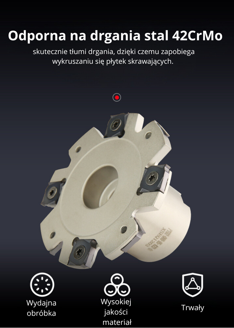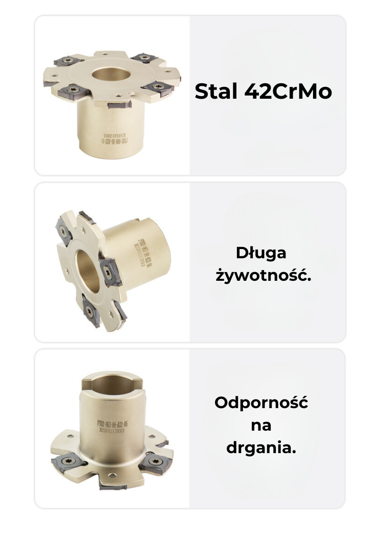 - Stalowa głowica 42CrMo4: Odporna na zużycie, drgania, wibracje oraz wysokie obciążenia podczas frezowania, co zwiększa trwałość narzędzia.