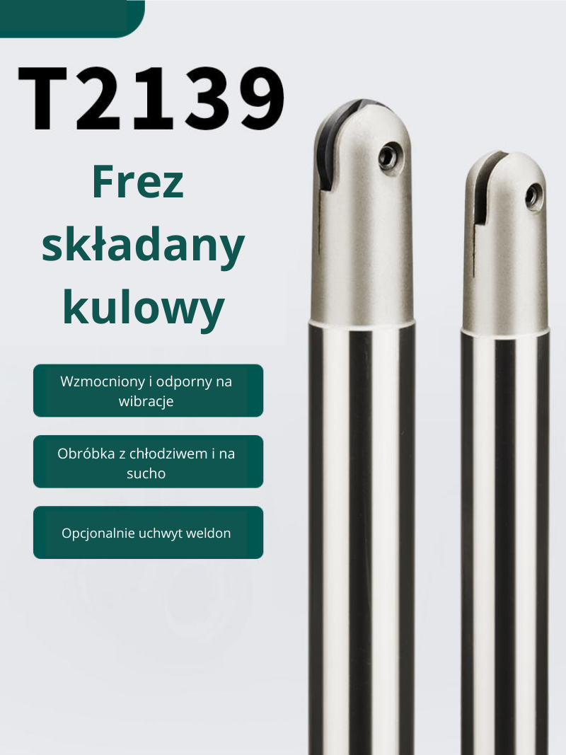 T2139 Frez Składany Kulowy T2139 - Głowica Promieniowa na Płytki Wymienne jest dedykowana do precyzyjnej obróbki promieni wewnętrznych i zewnętrznych,oraz konturowania 3D. Jest to najlepsze rozwiązanie kosztowe w porównaniu do tradycyjnych frezów HSS i frezów węglikowych kulowych dzięki możliwości taniego dokupienia wymiennych płytek odpornych na zużycie i wysokie temperatury. Co więcej, głowica pozwala na obróbkę na sucho, bez konieczności stosowania chłodziwa, co dodatkowo obniża koszty operacyjne.