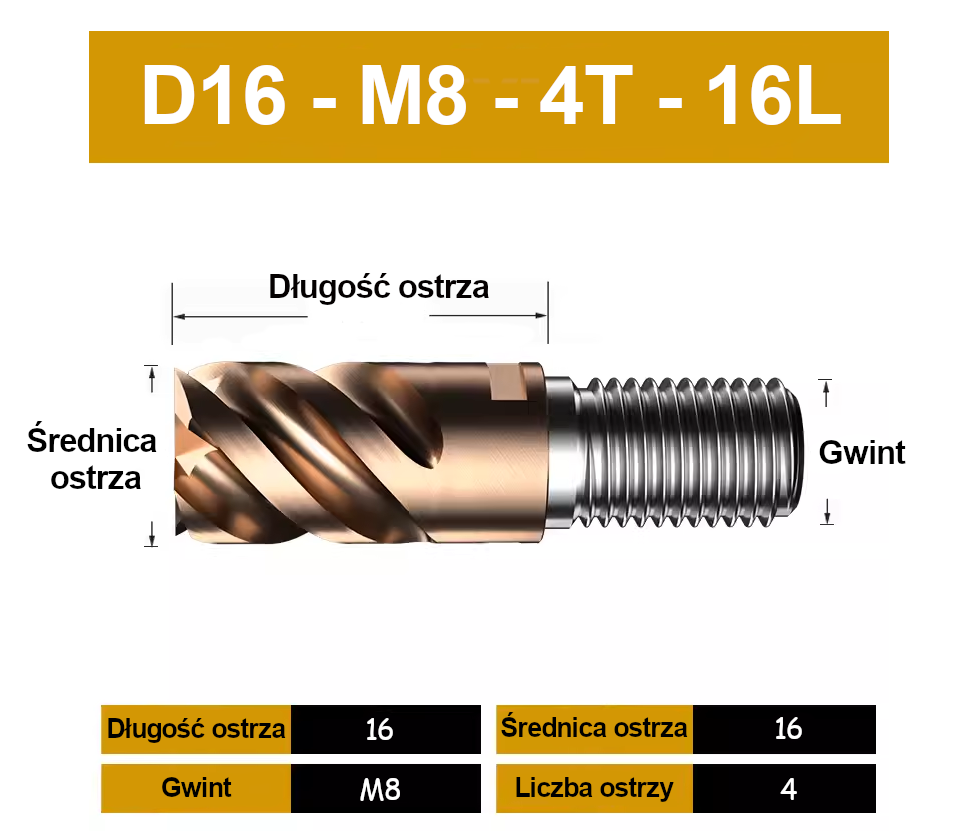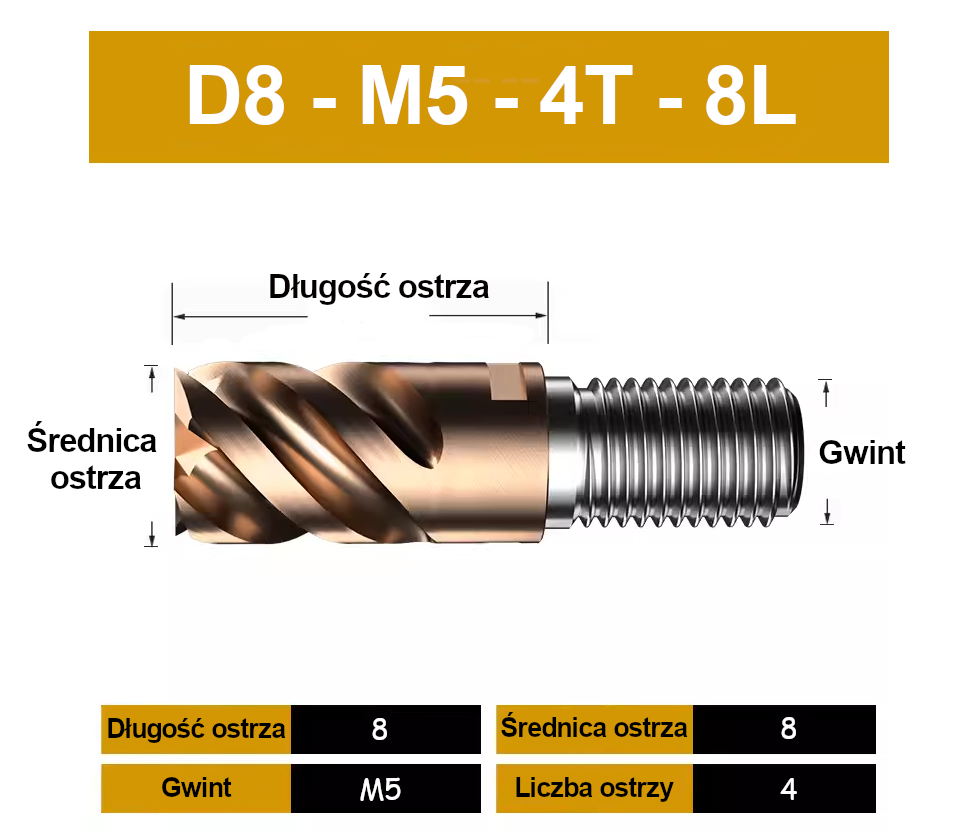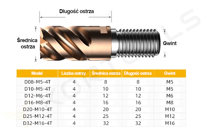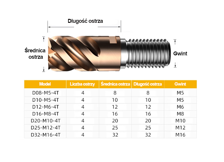 - Średnice ostrza: Ø8, Ø10, Ø12, Ø16, Ø20, Ø25, Ø32.