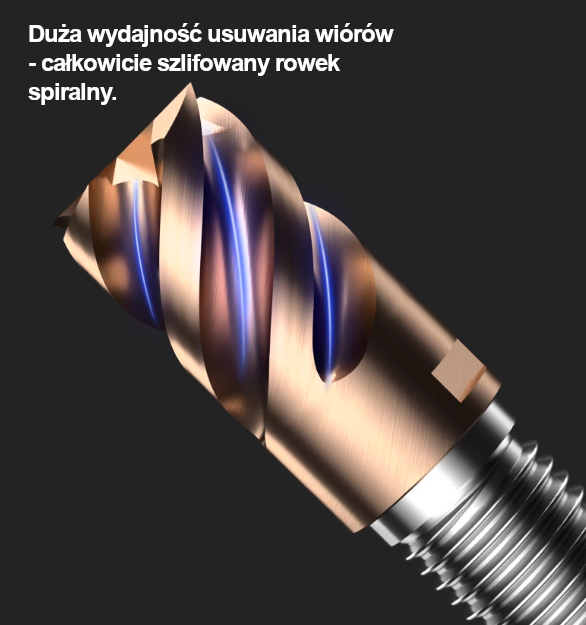 - Duża wydajność usuwania wiórów - całkowicie szlifowany rowek spiralny.