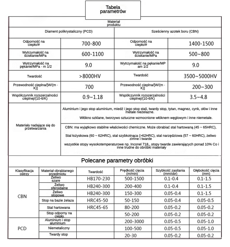 - Płytki borazonowe są wykonane z tego materiału i charakteryzują się wyjątkową twardością i odpornością na ścieranie. Twardość obróbki: HRC45-70 HRC