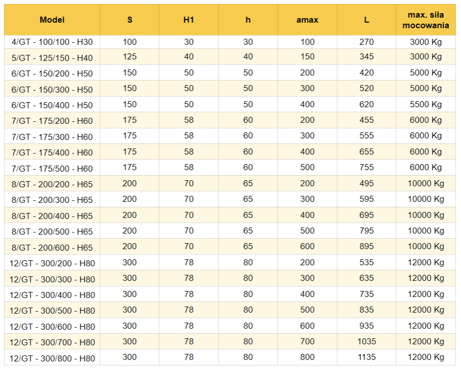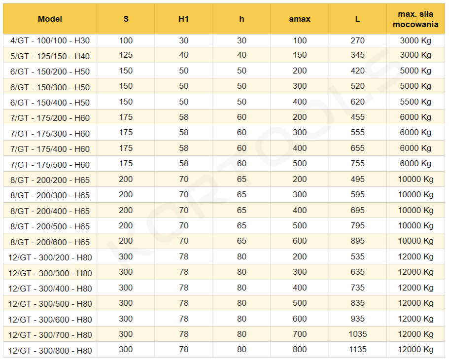 - 6/GT - 150/200 - H50 - szerokość szczęki 150mm; max otwarcie szczęk 200mm; wysokość szczęki 50mm. Reszta informacji w tabeli niżej: