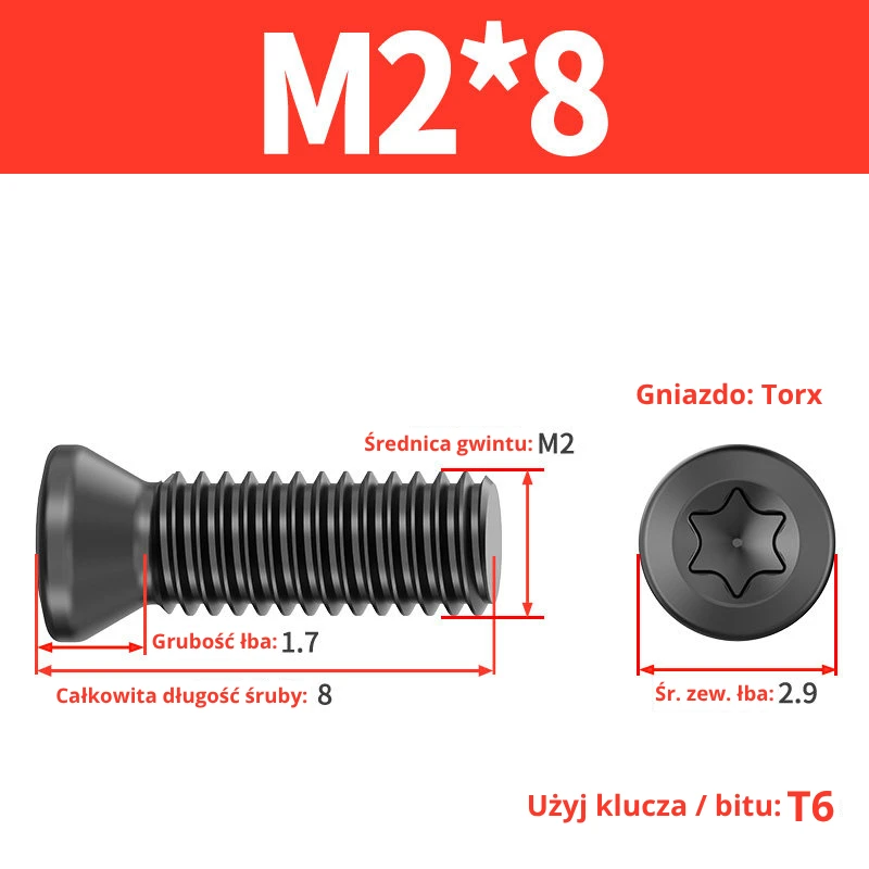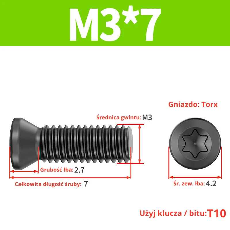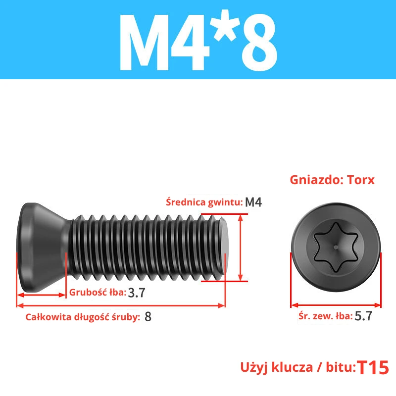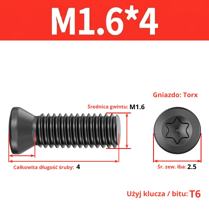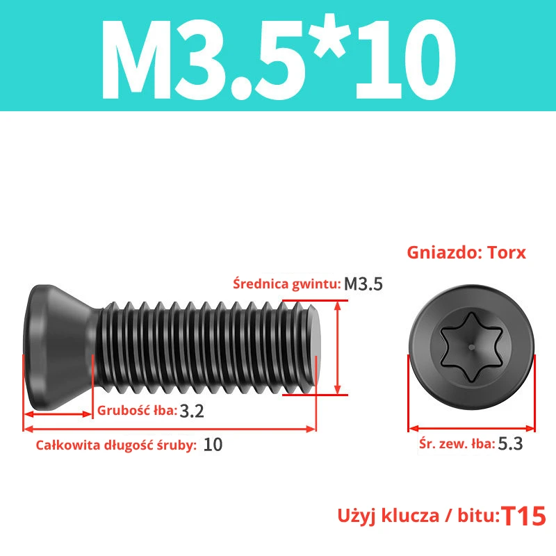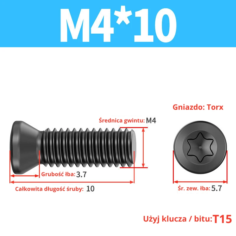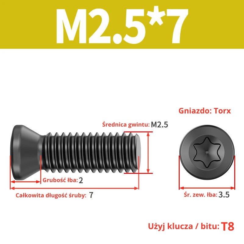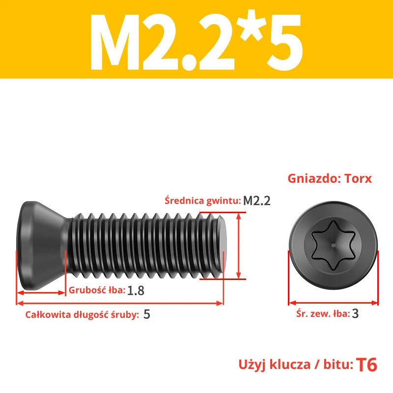 Śruby dociskowe, mocujące do płytek wieloostrzowych z gniazdem TORX przeznaczone do noży tokarskich, głowic frezerskich, wierteł składanych.