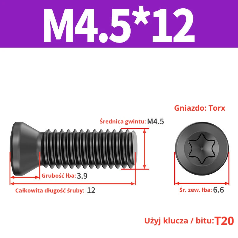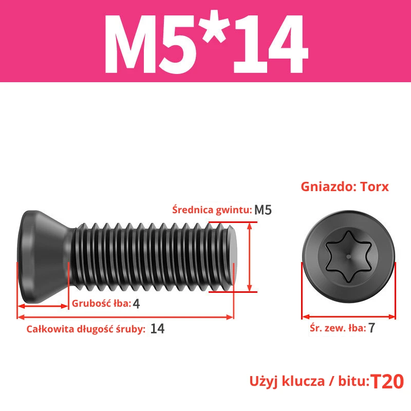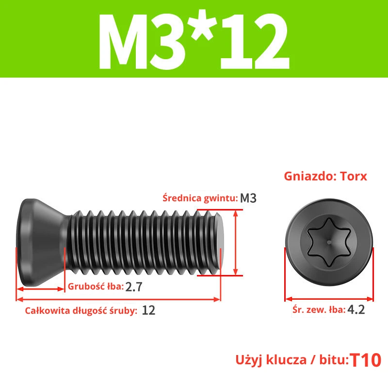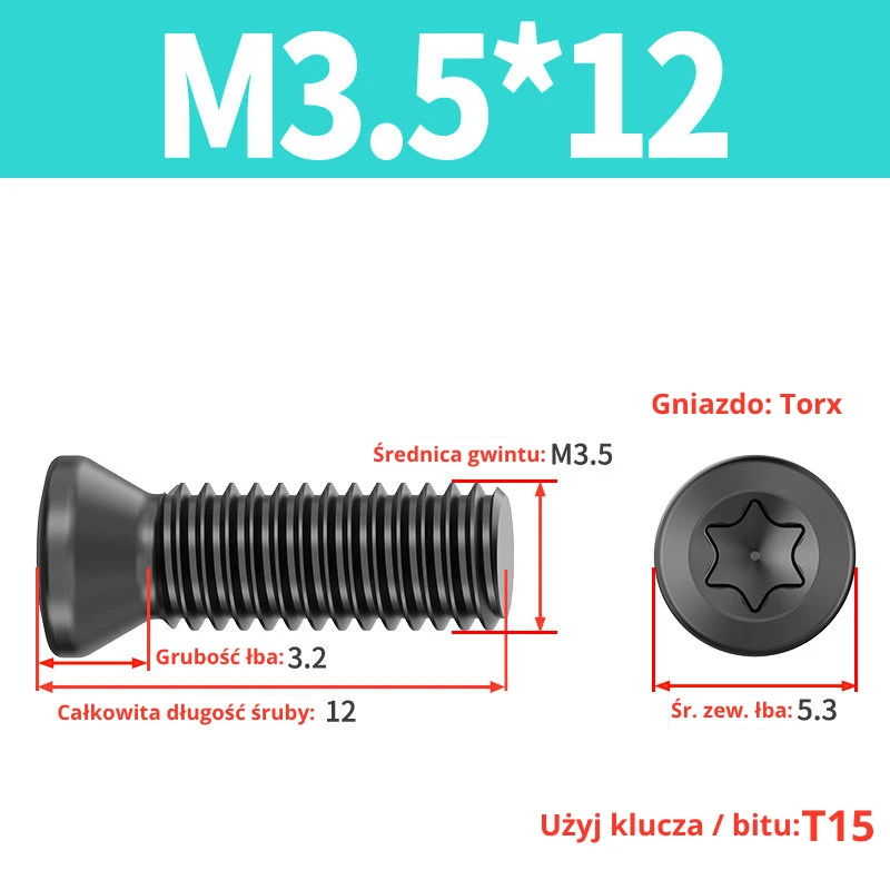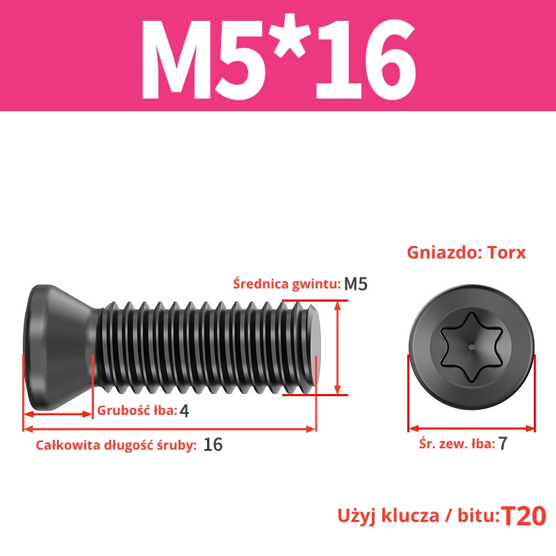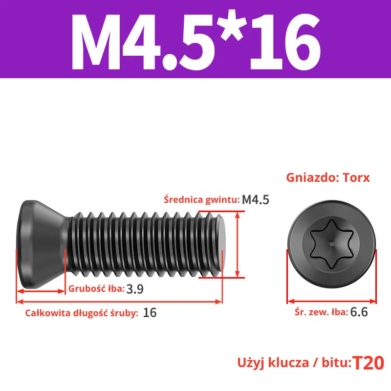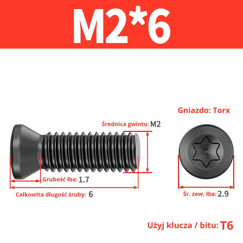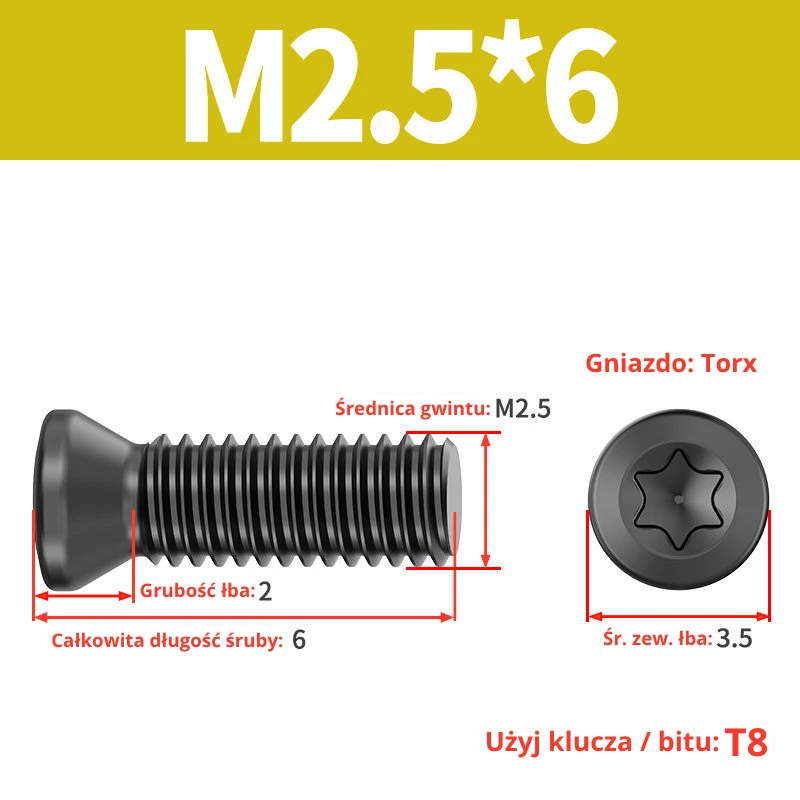 Śruby dociskowe, mocujące do płytek wieloostrzowych z gniazdem TORX przeznaczone do noży tokarskich, głowic frezerskich, wierteł składanych.